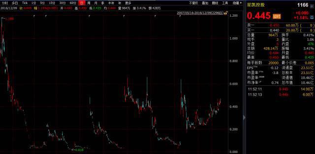 以星凯控股(1166.HK)为例,2008年初时,股价0.4元左右,现在的价格也是0.4元左右。虽然8年时间价格没什么变化,但是经过4次合股之后,股数却缩小到了之前的2万分之一。图中几次大幅跳空缺口就是合股。